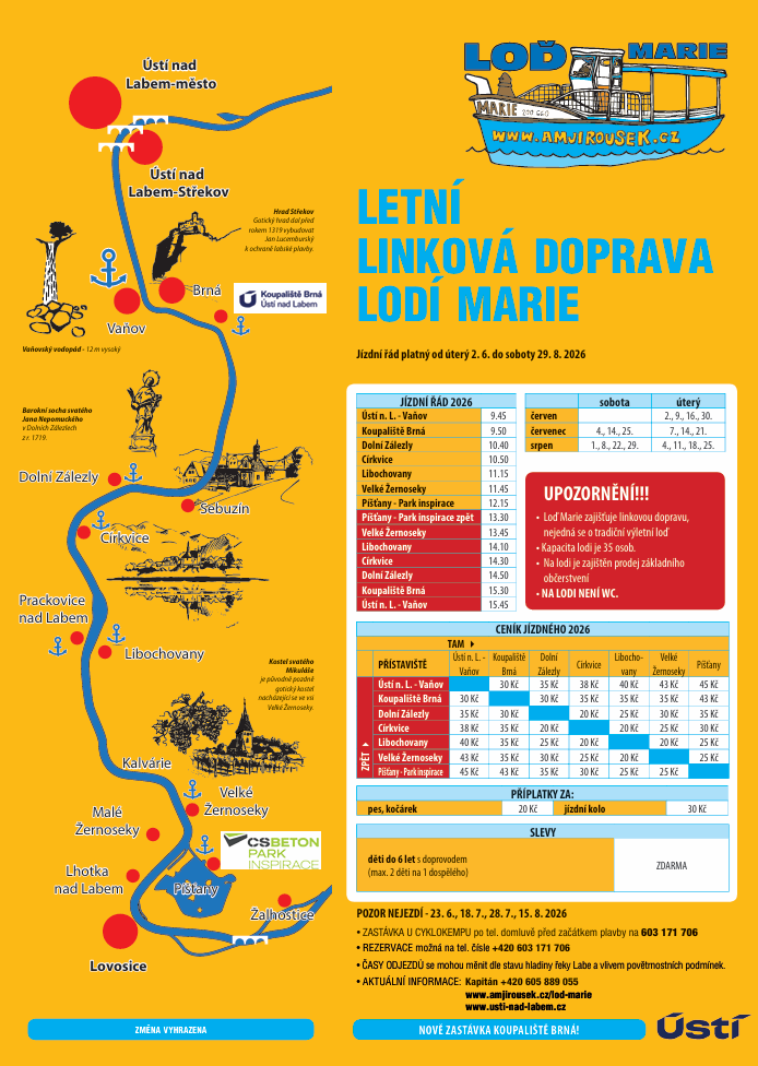 Loď Marie není tradiční výletní lodí. Kapacita lodi je 35 osob s možností rezervace na uvedených telefonních číslech. Je zde zajištěn prodej základního občerstvení, ale na lodi není WC.