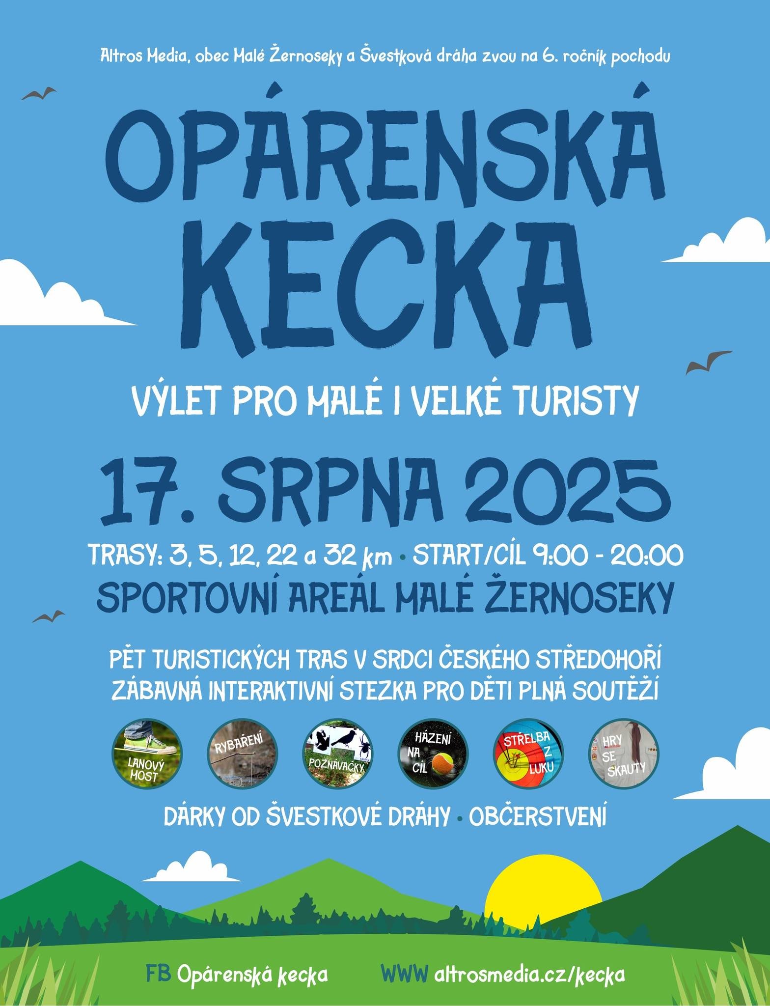 Altros Media, obec Malé Žernoseky a společnost AŽD Praha zvou na šestý ročník turisticko-zábavné akce, kde si na své přijdou malí i velcí turisté i neturisté. OPÁRENSKÁ KECKA vás zavede na jedna z nejhezčích míst Českého středohoří.