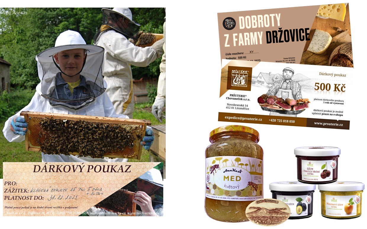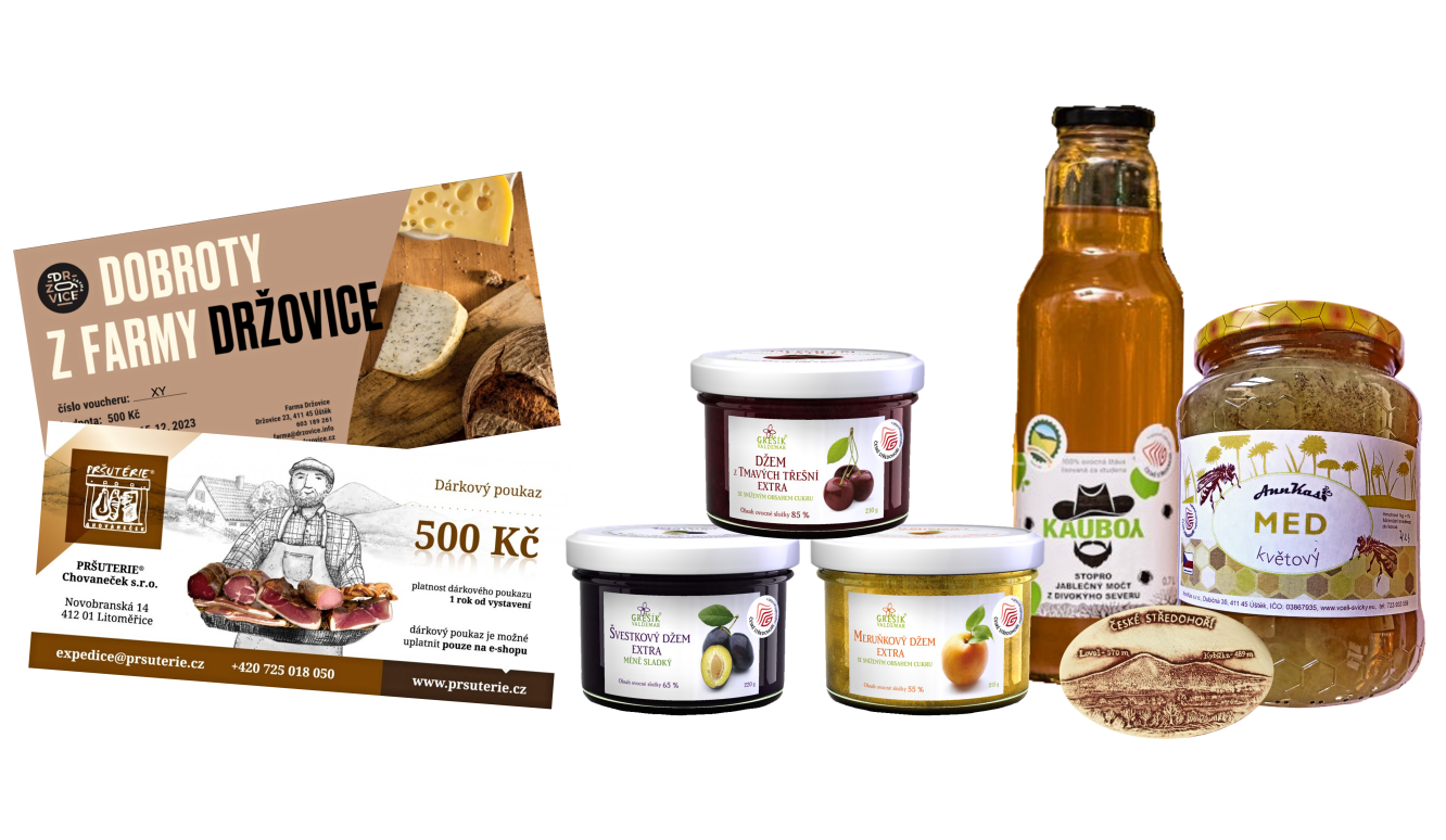 3. místo: Poukaz na Dobroty z farmy Držovice a Pršutérie Chovaneček v hodnotě 500 Kč, med z včelí farmy AnnKas, 3x džem od Valdemara Grešíka, mošt Kauboy a keramická magnetka od Moniky Látové.