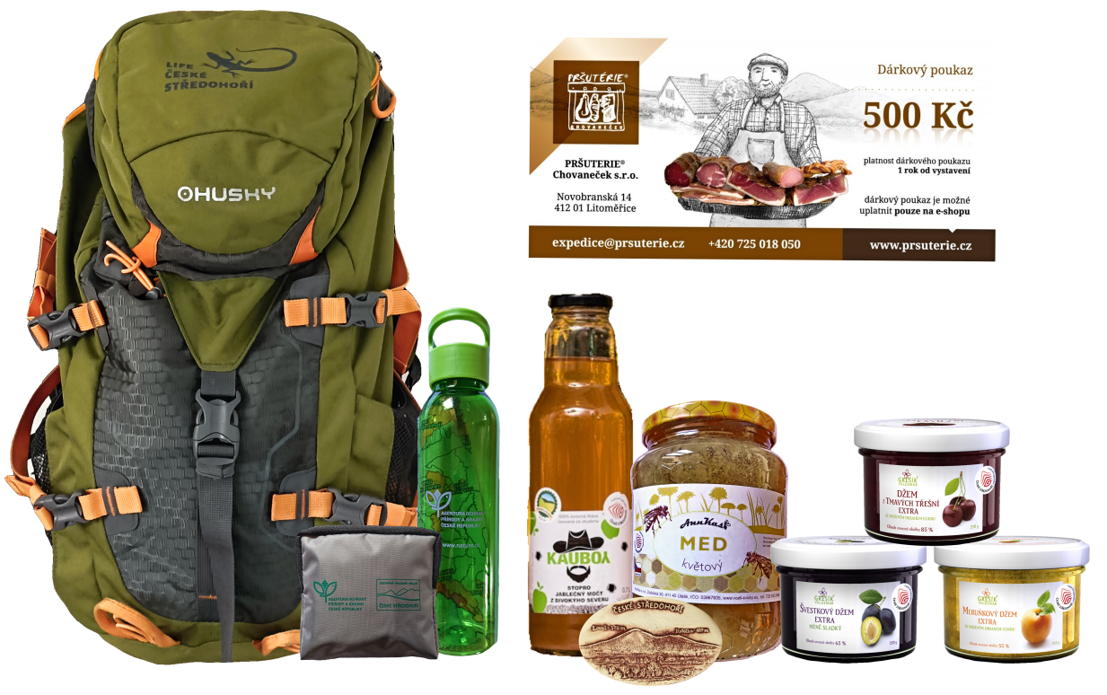 2. místo: Batoh Husky SCAPE 38l s logem LIFE České středohoří, kapesní lékarnička, 500 ml láhev s logem AOPK ČR, poukaz do Pršutérie Chovaneček v hodnotě 500 Kč, med z včelí farmy AnnKas, 3x džem od Valdemara Grešíka, mošt Kauboy a keramická magnetka od Moniky Látové.