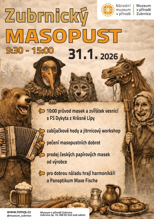 Jitrnice a další zabíjačkové pochoutky, koláče a veselé písničky. Masopustní průvod se zvířátky obcí Zubrnice, se zastávkami u pohostinných sousedů, pro návštěvníky v maskách. Folklorní soubor DYKYTA z Krásné Lípy, flašinet i harmonika. Součástí akce je oživená historie masopustu i prodej tradičních masek.